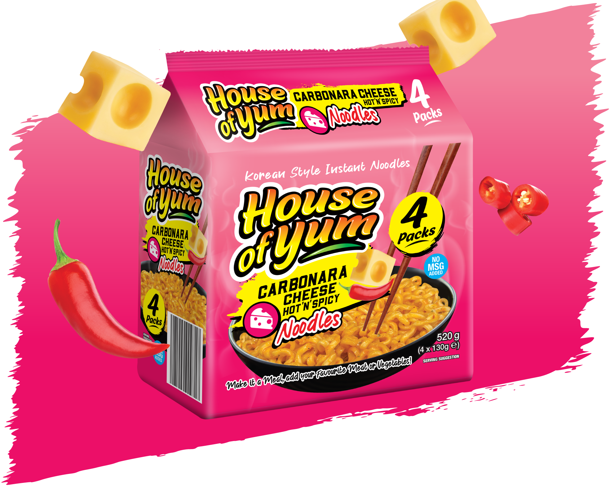 Noodles(79.62%) [Wheat flour, Palm oil RSPO(contain Antioxidant BHT (E321)), Tapioca starch, Salt, Thickener(Sodium carboxymethyl cellulose (E466)), Humectant(Phosphates(E450(i), E450(iii), E451(i), E452(i)), Acidity regulator(sodium bicarbonate(E500(ii))], Seasoning powder(20.38%) {Milk powder, Egg yolk powder, Cheese powder, Salt, Sugar, Non-dairy cream[Palm oil, Glucose syrup, Sodium caseinate(from Milk), Emulsifiers (contains E340(ii), E471, E427b)], Black pepper powder, Onion powder, Flavour Enhancers (contains Disodium 5' - inosinate, Disodium 5' - guanylate(E631, E627), Glycined(E640), Disodium succinate(E364)), Dried parsley, Flavouring(Cheese flavor, Milk flavor), Anti-caking(contains Silicon dioxide(E551)), Food color (E100(ii))}.