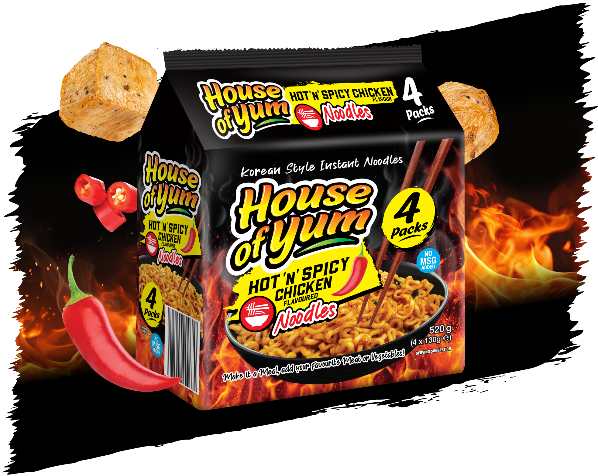 Noodles (83%) {Wheat flour, Palm Oil RSPO [Includes Antioxidant (321)], Tapioca Starch, Salt, Thickener (466), Humectant (450(i), 450(iii), 451(i), 452(i)), Acidity Regulator (500)]}. Seasoning Powder (15%) {Chicken seasoning flavour [Soy Sauce powder (Soybean, Wheat flour, Salt)], Chilli powder, Sugar, Pepper powder, Sesame Seed, Garlic powder, Salt, Creamer [Palm oil, Glucose syrup, Sodium caseinate (Milk), Emulsifiers (340 (ii), 471)], Paprika powder, Flavour enhancers (Disodium inosinate, Disodium guanylate), Chilli extract, Anti-caking agent (551), Acidity regulator (330), Colour (150a, 150d, 160c)}. Seasoning oil (2.5%) Palm oil RSPO [Includes Antioxidant (321)], Fried garlic oil, Chilli pieces, Colour (160c)}, Dried carrot, Dried cabbage.